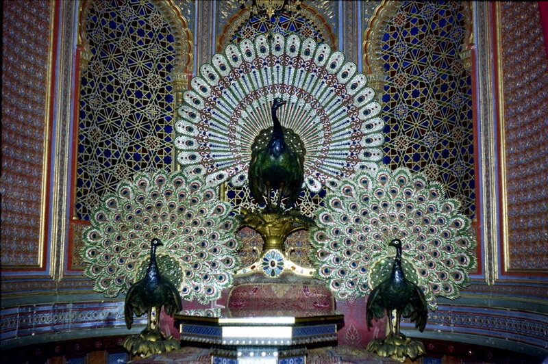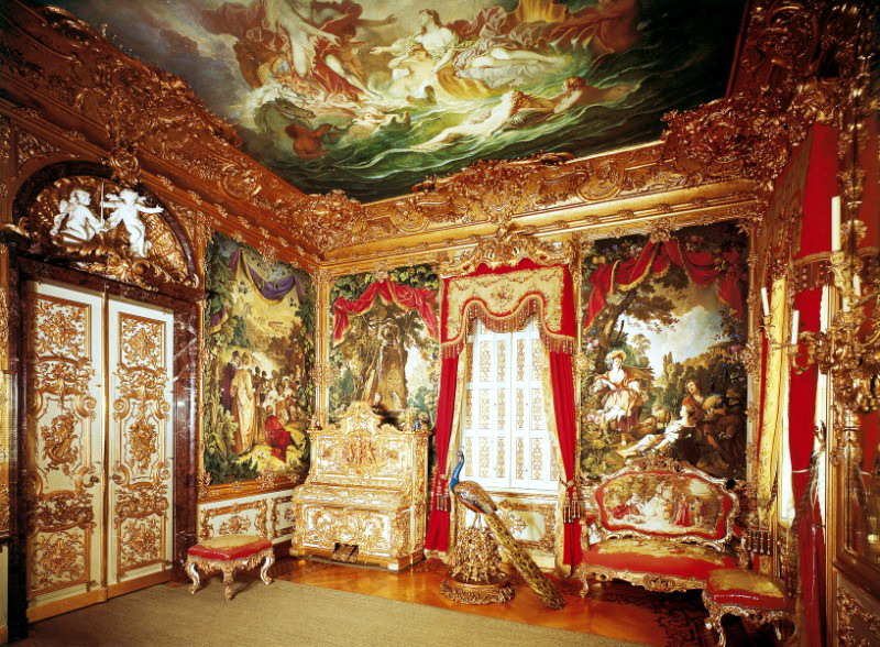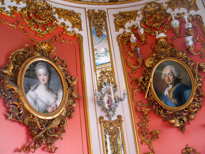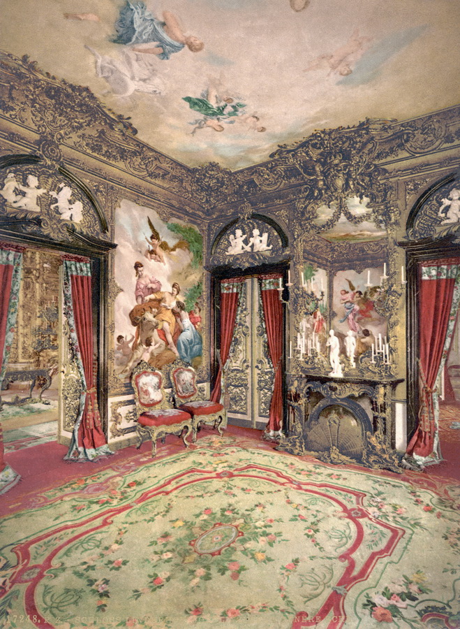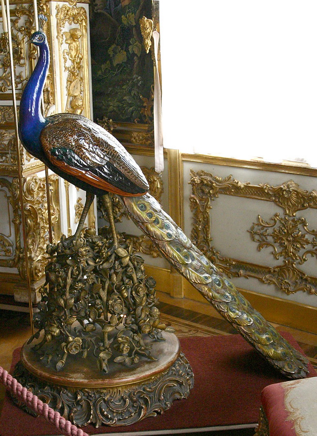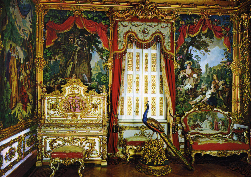 Картины, напоминающие гобелены, а также обивка мебели, изготовленная на парижской гобеленовой фабрике, изображают сцены светской и пастушеской жизни в стиле рококо. Рядом с богато украшенным музыкальным инструментом – необычной комбинацией рояля и фисгармонии, дошедшей до нас из XIX века, стоит павлин в натуральную величину из расписного севрского фарфора. Эта гордая и пугливая птица слыла, подобно лебедю, любимым существом короля.