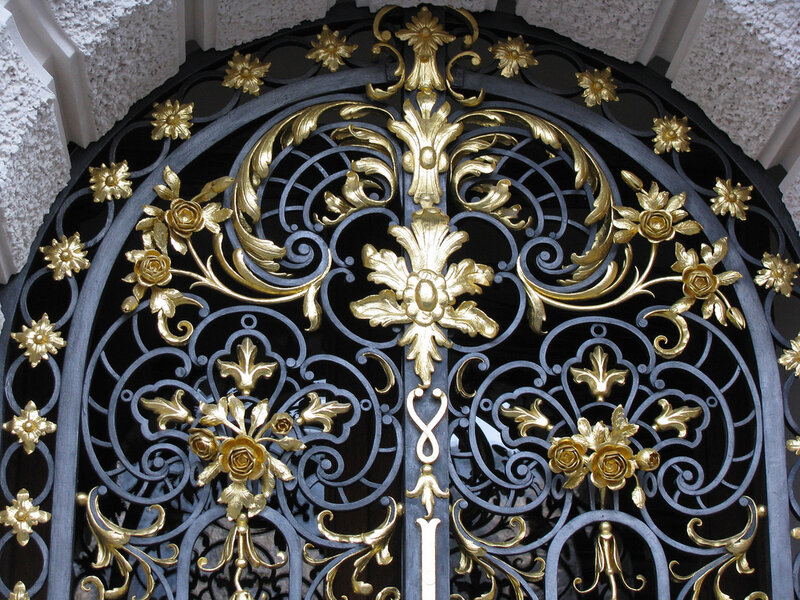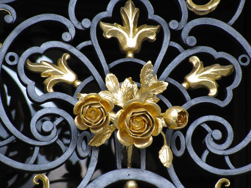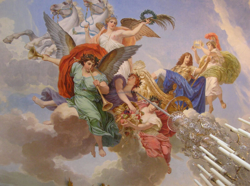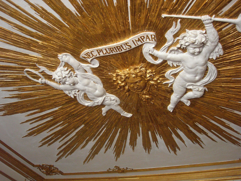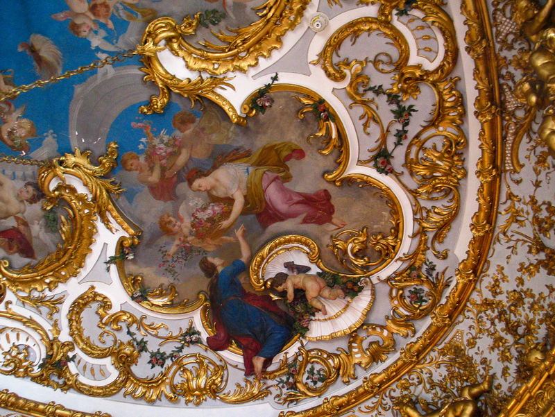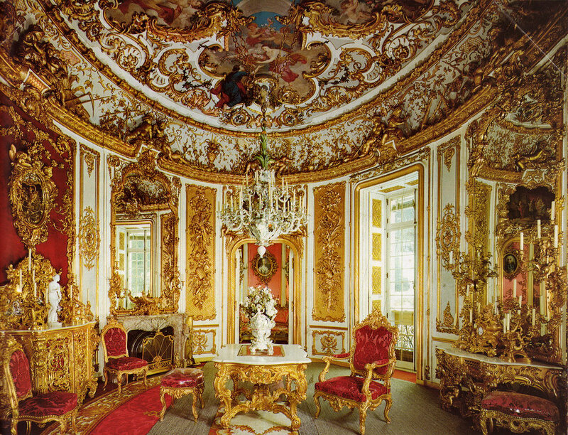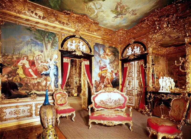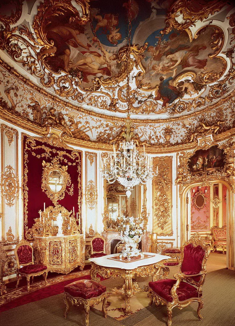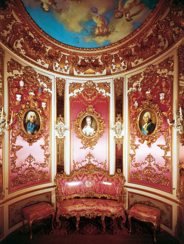 Настольная ваза, равно как и многорожковая фарфоровая люстра, изготовлена в Мейссене на фарфоровой мануфактуре. Первоначальные эскизы для картин, выполненных в иллюзорном стиле барокко, разработал Кристиан Янк в 1870-1872 гг. При открытых дверях взгляд привлекают портреты на стенах Розового и Голубого кабинетов.