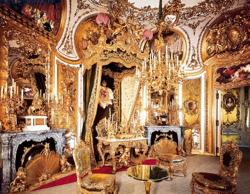Королевская опочивальня, спроектированная в 1871г. театральным художником Анджело Квальо, была расширена Юлиусом Гофманном в 1884г. по образцу "Богатой комнаты" в Мюнхенской резиденции до самой большой комнаты замка. Это - центральное и самое вместительное помещение замка, расположенное по его средней оси, с видом на каскады северного склона, освещавшееся прежде ста восемью свечами хрустального канделябра, с преобладающим королевским голубым цветом. Мраморные скульптуры, лепнина и потолочная роспись выдают склонность к образам античной мифологии. Над нишей, в которой установлено ложе, сияет в "Аллегории Утра" солнечная карета Аполлона в потолочной росписи Людвига Лескера.