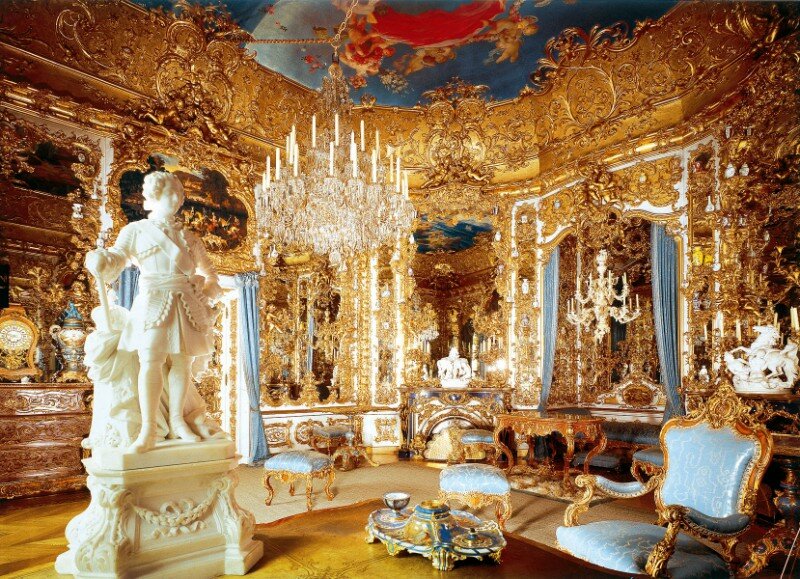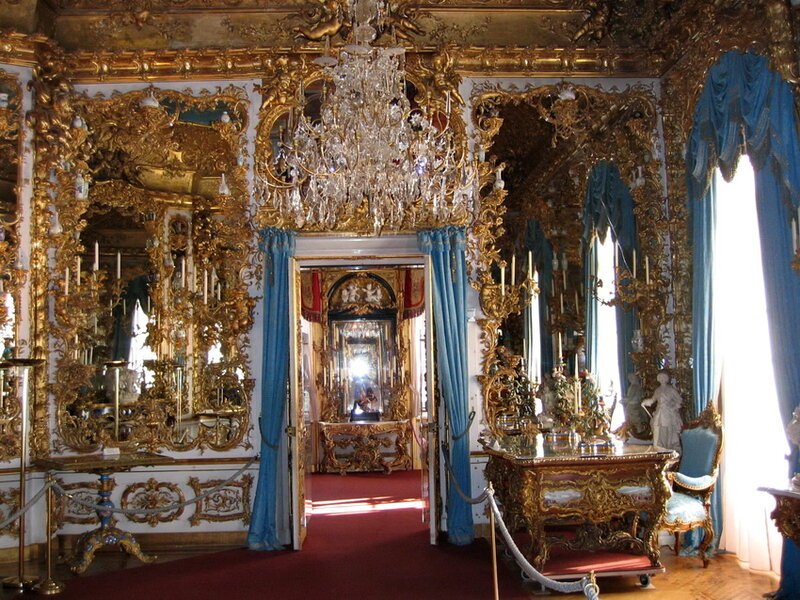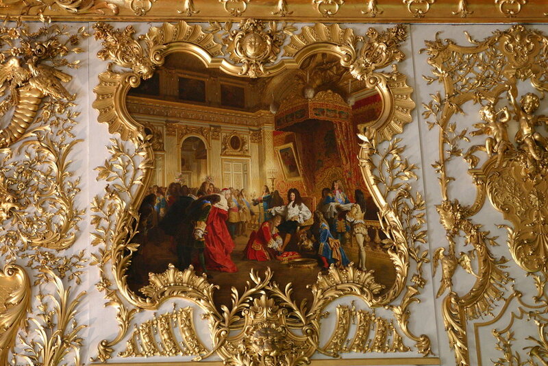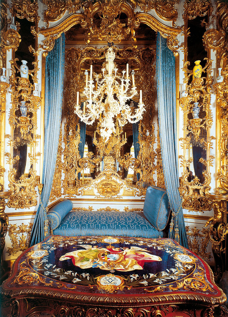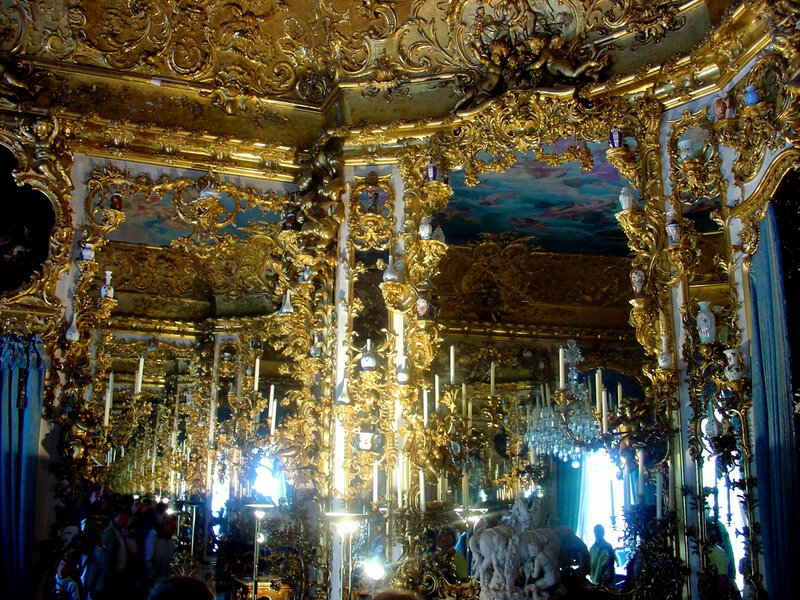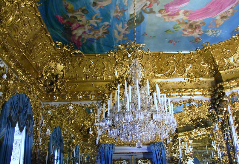 Огромные зеркала, встроенные в бело-золотую обшивку стен, создают иллюзию нескончаемой череды помещений. В них разбивается блеск хрустальной люстры, отражается матовый блеск резного светильника слоновой кости, многократно отображаются драгоценные украшения и помещение уходит в бесконечность. Напротив вереницы окон в заднюю стену встроена также остекленная ниша со скамьей для отдыха.