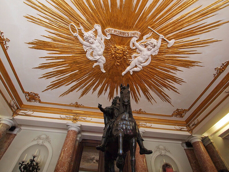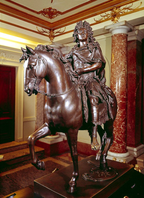 В вестибюле дворца, обрамленного колоннами красного мрамора и пилястрами, установлена бронзовая конная статуя короля Франции Людовика XIV. В венке из солнечных лучей красуется девиз династии Бурбонов: "Nec Pluribus Impar" ("Достойный многих"), как знак преклонения короля Людвига II перед королевством Бурбонов.