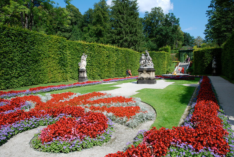 Крутые склоны долины Грасвангталь создают естественные природные условия для сада при замке Линдерхоф. Террасные сады в стиле Ренессанса, стилизованные цветочные клумбы в стиле барокко и длинный естественный ландшафтный сад в английском стиле, были чудесным образом превращены Карлом фон Эффнером во вдохновенное и чарующее единое произведение садовой культуры.