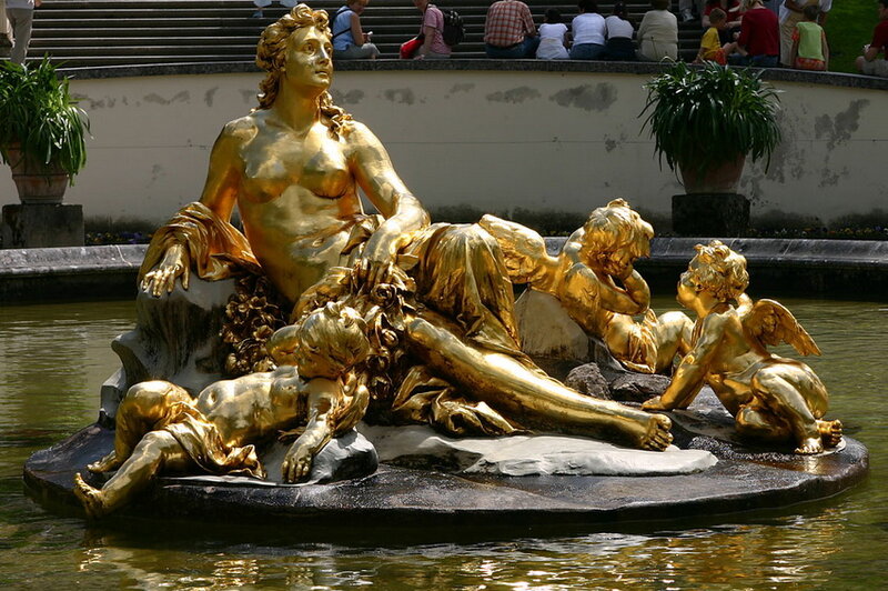 Галереи с липовыми сводами, начинаясь непосредственно за замком, уводят вверх по крутому северному склону от строго орнаментального сада-ковра в форме лилии Бурбонов. Поднятая на высоту павильона – двойника храма Венеры на юге, вода стекает вниз каскадами, по тридцати мраморным ступеням, в бассейн с фонтаном, украшенным скульптурной группой Нептуна.